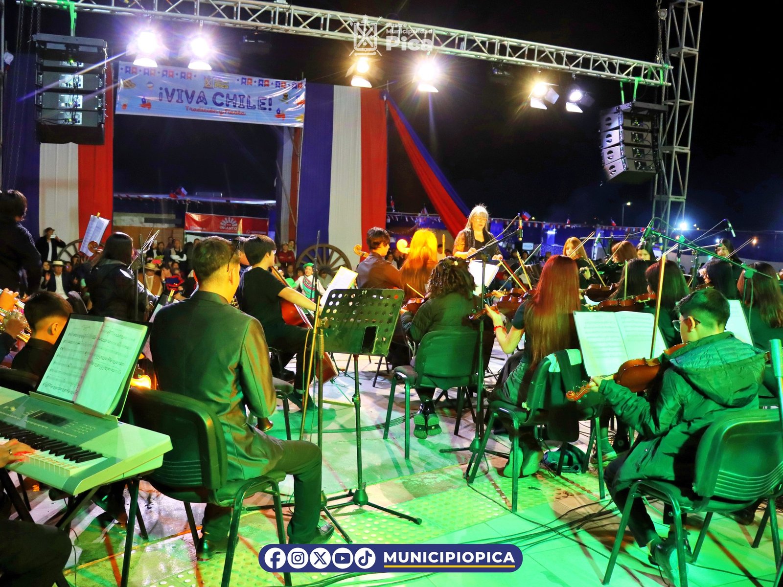 La noche alcanzó su punto más alto con la presentación de la Orquesta Sinfónica Infantil Juvenil de Pica. Bajo la dirección de la maestra Emma Cárdenas, los jóvenes músicos deleitaron con un repertorio patrio que hizo vibrar al público, recordándonos que el talento y el amor por la patria florecen con fuerza en nuestra tierra.