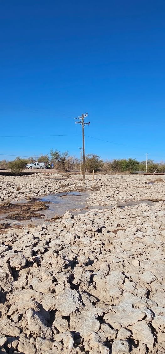 El personal técnico de CGE se encuentra trabajando en el sector Canchones, tramo Camino Tuberías, donde se detectó una rotura en la matriz de agua que reblandeció el terreno y provocó la inclinación de un poste de media tensión.