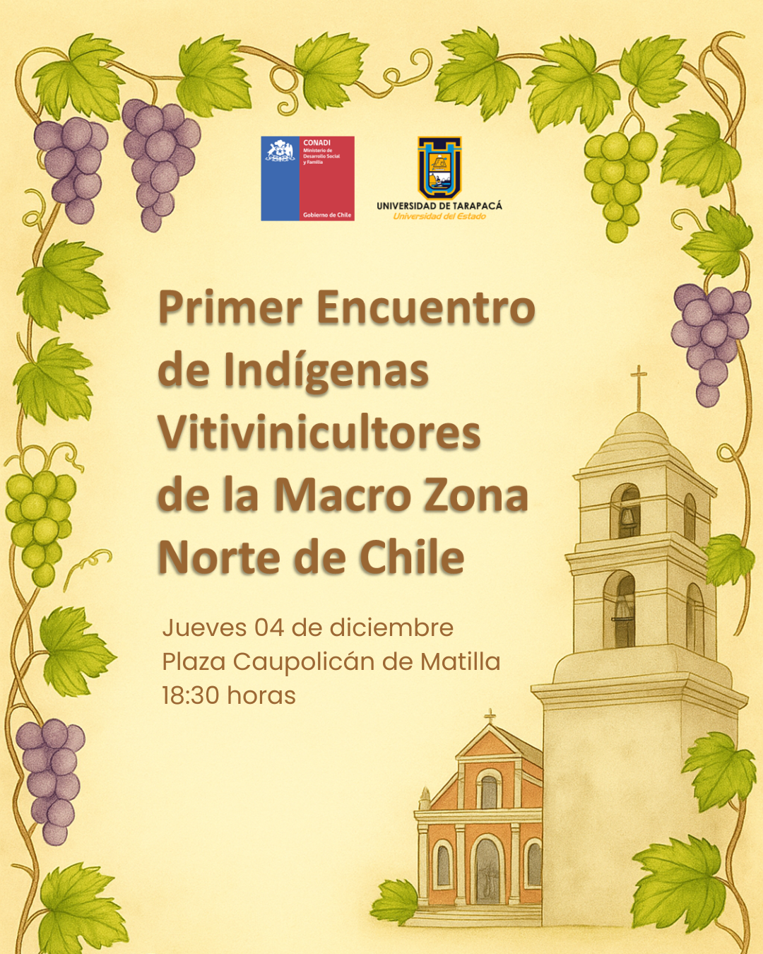 – La Corporación Nacional de Desarrollo Indígena (CONADI) realizará el Primer Encuentro de Indígenas Vitivinicultores de la Macro Zona Norte de Chile, que se llevará a cabo el jueves 4 de diciembre de 2025, a las 18:30 horas, en la plaza Caupolicán de Matilla, comuna de Pica.