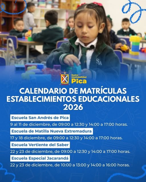 Ya se acerca el proceso de matrículas para el año 2026 en nuestros establecimientos municipales. Invitamos a madres, padres y apoderados a participar y asegurar el cupo de sus hijos e hijas en las fechas establecidas por cada escuela.