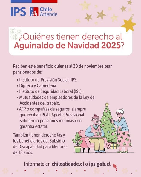 Para información general del aguinaldo, están disponibles los sitios www.ips.gob.cl, www.chileatiende.cl, Call Center 101 o 600 440 0040, redes sociales @ChileAtiende en X, Facebook e Instagram y las sucursales ChileAtiende del IPS en todo el país.