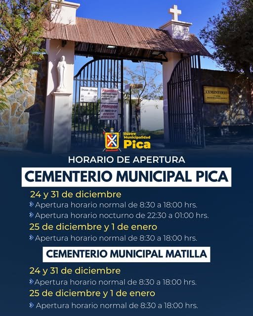 Con motivo de estas fechas, el Cementerio Municipal de Pica mantendrá su horario normal de atención y contará además con una apertura nocturna especial el día 24 y 31 de diciembre, para facilitar la visita de las familias.