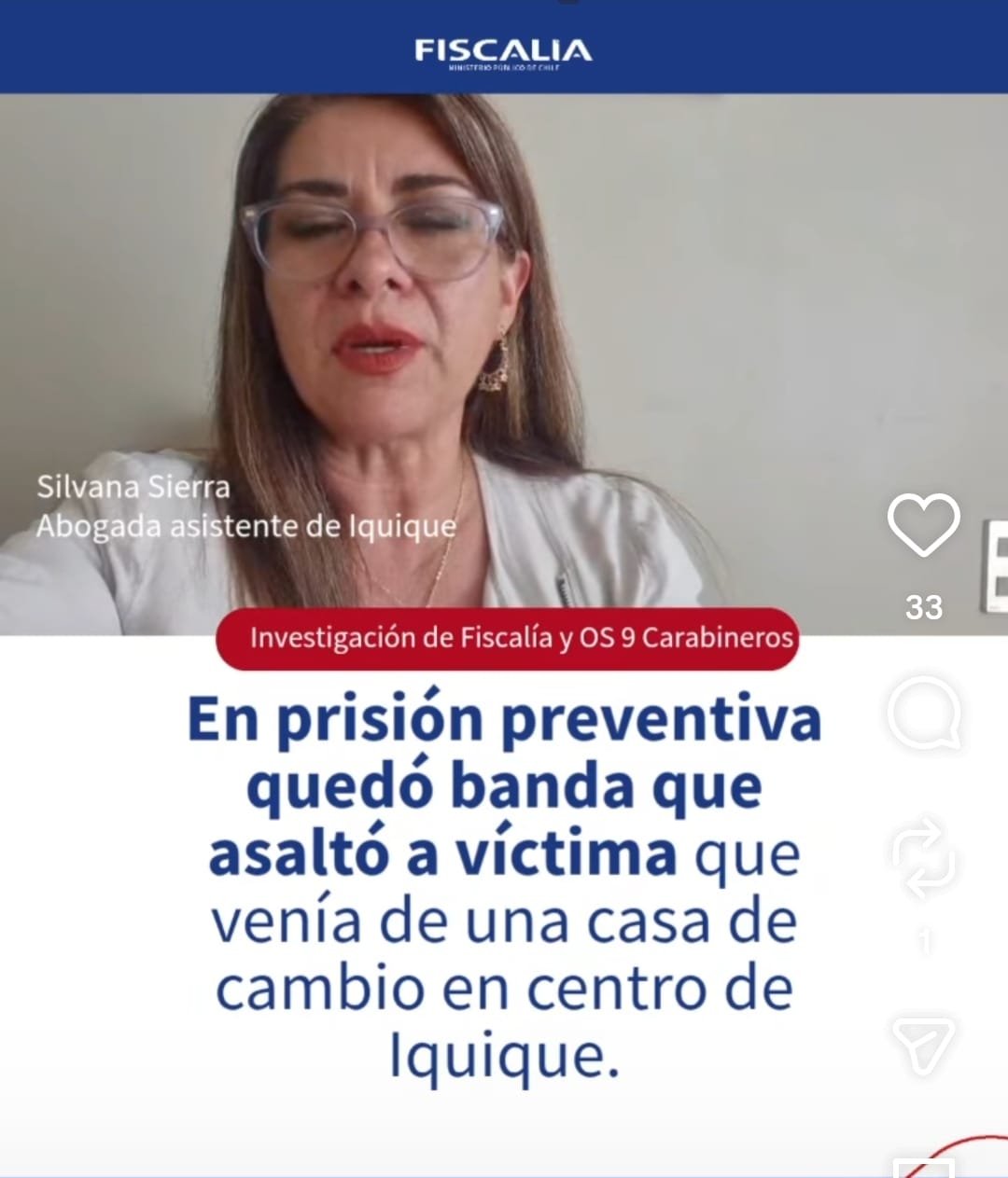 En la audiencia de formalización, la abogada asistente de la unidad de Delitos Violentos (s) Silvana Sierra explicó que, en el marco de una investigación seguida con el OS 9 de Carabineros por delitos de robos ocurridos cerca de zona franca en la modalidad conocida como “salida de banco”; el lunes pasado se recibió un llamado al 133 de una persona que se encontraba en el centro de Iquique, en el sector donde se ubican las casa de cambio, y oyó cuando una mujer hablaba por teléfono dando indicaciones sobre una persona que iba sola con un bolso.
