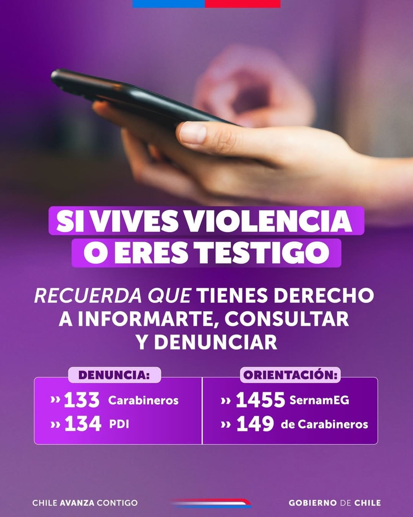 Asimismo, reiteraron que, ante una situación de riesgo o peligro inminente, es fundamental realizar la denuncia a través del 133 de Carabineros o el 134 de la Policía de Investigaciones (PDI).