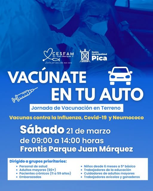 Este sábado 21 de marzo te invitamos a ser parte de esta importante jornada de vacunación en terreno, pensada para cuidar tu salud de forma rápida, segura y sin bajarte del vehículo