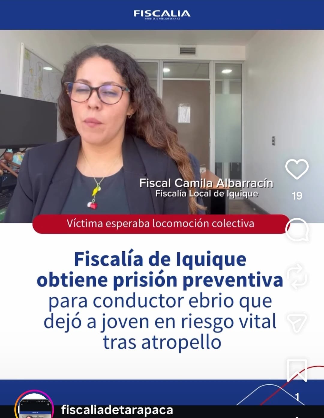 En prisión preventiva quedó un imputado formalizado por la Fiscalía Local de Iquique por su responsabilidad en un atropello y posterior choque que dejó a una joven de 22 años en riesgo vital, accidente que fue provocado mientras conducía en estado de ebriedad.