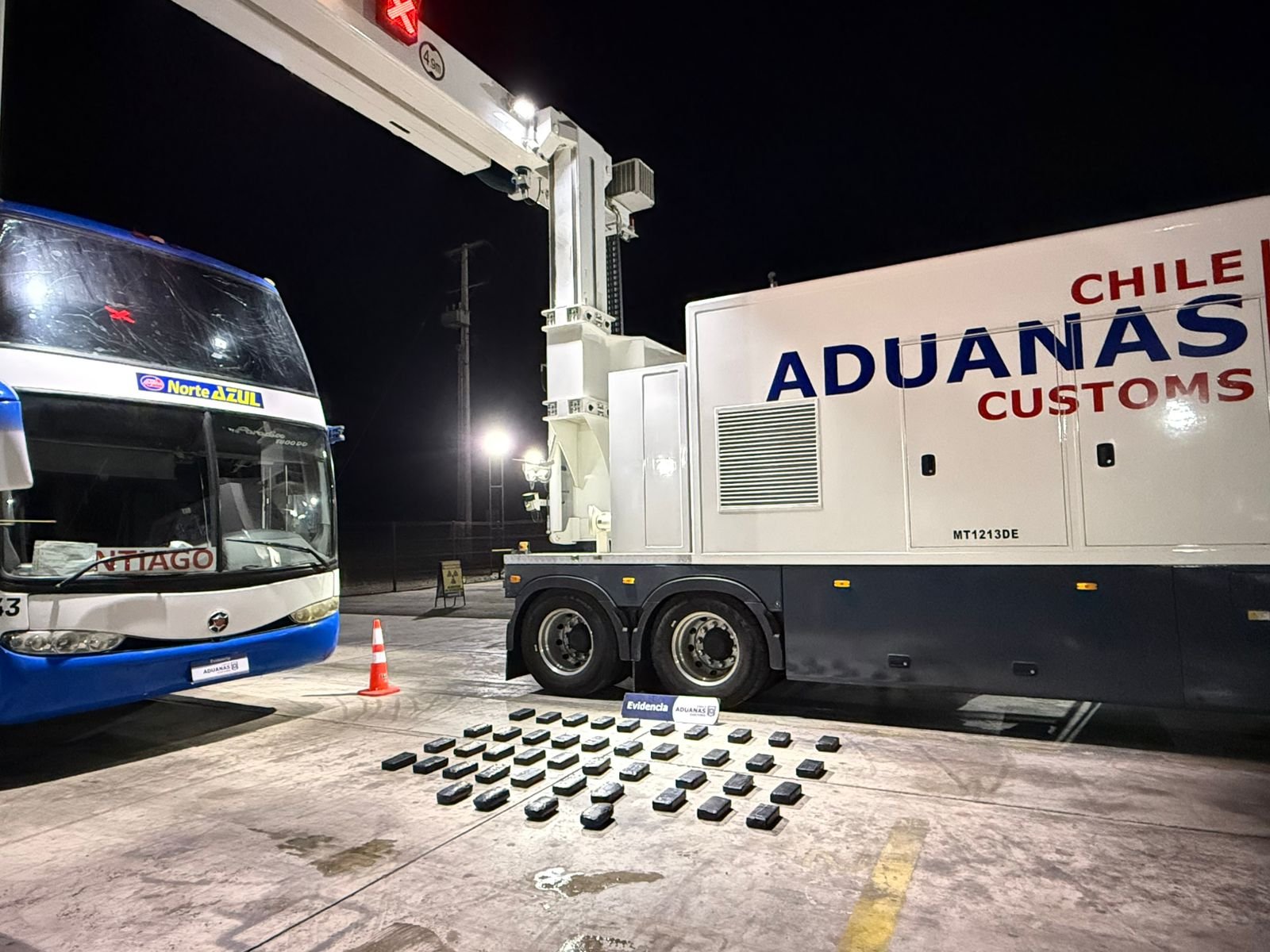 – Un millonario contrabando de drogas detectó el camión escáner de Aduanas al inspeccionar un bus de la empresa Norte Azul que viajaba con 29 pasajeros desde Iquique a Santiago. La sustancia ilícita estaba oculta en la cabina del conductor y se trata de 48 kilos 300 gramos de pasta base de cocaína y 4 kilos 550 gramos de ketamina.