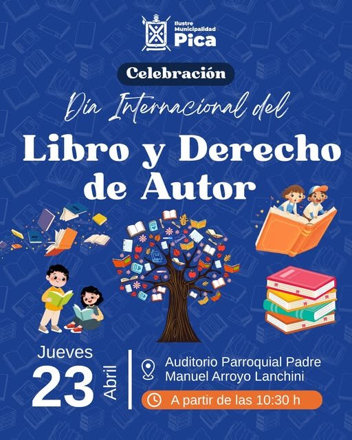 La Ilustre Municipalidad de Pica invita a toda la comunidad a ser parte de la celebración del Día Internacional del Libro y Derecho de Autor. Una jornada especial para fomentar la lectura, la creatividad y el valor de los libros como fuente de aprendizaje y cultura.